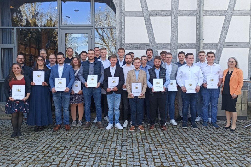Gruppenbild aller Neubürgerinnen und Neubürger des Hohenlohekreises mit Landrat Ian Schölzel, Dezenent Mike Weise sowie Öhringens Oberbürgermeister Patrick Wegener.
