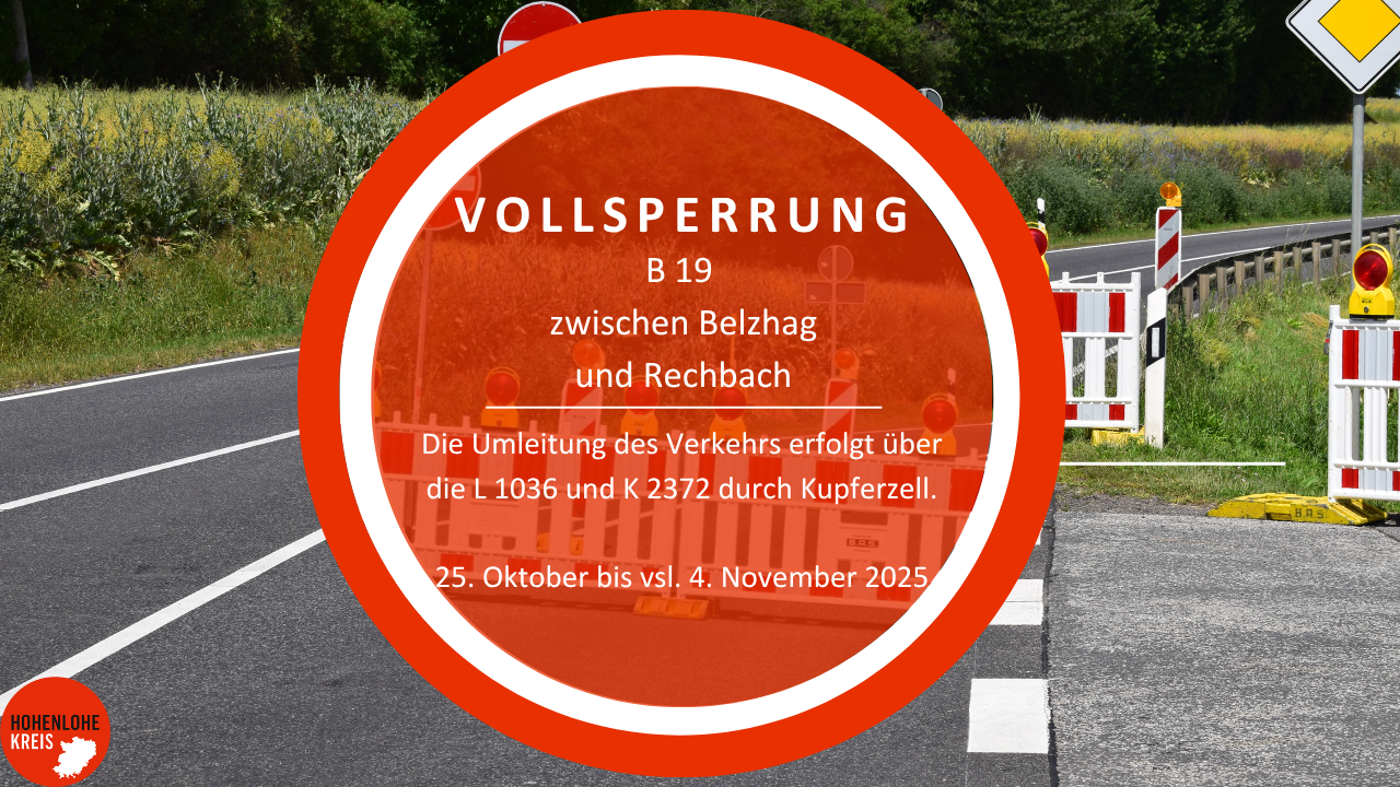 Seit 25. Oktober 2025 ist die B 19 zwischen den Knotenpunkten mit der L 1036 bei Kupferzell Belzhag und der K 2372 Abzweigung Rechbach vollständig für den Verkehr gesperrt.