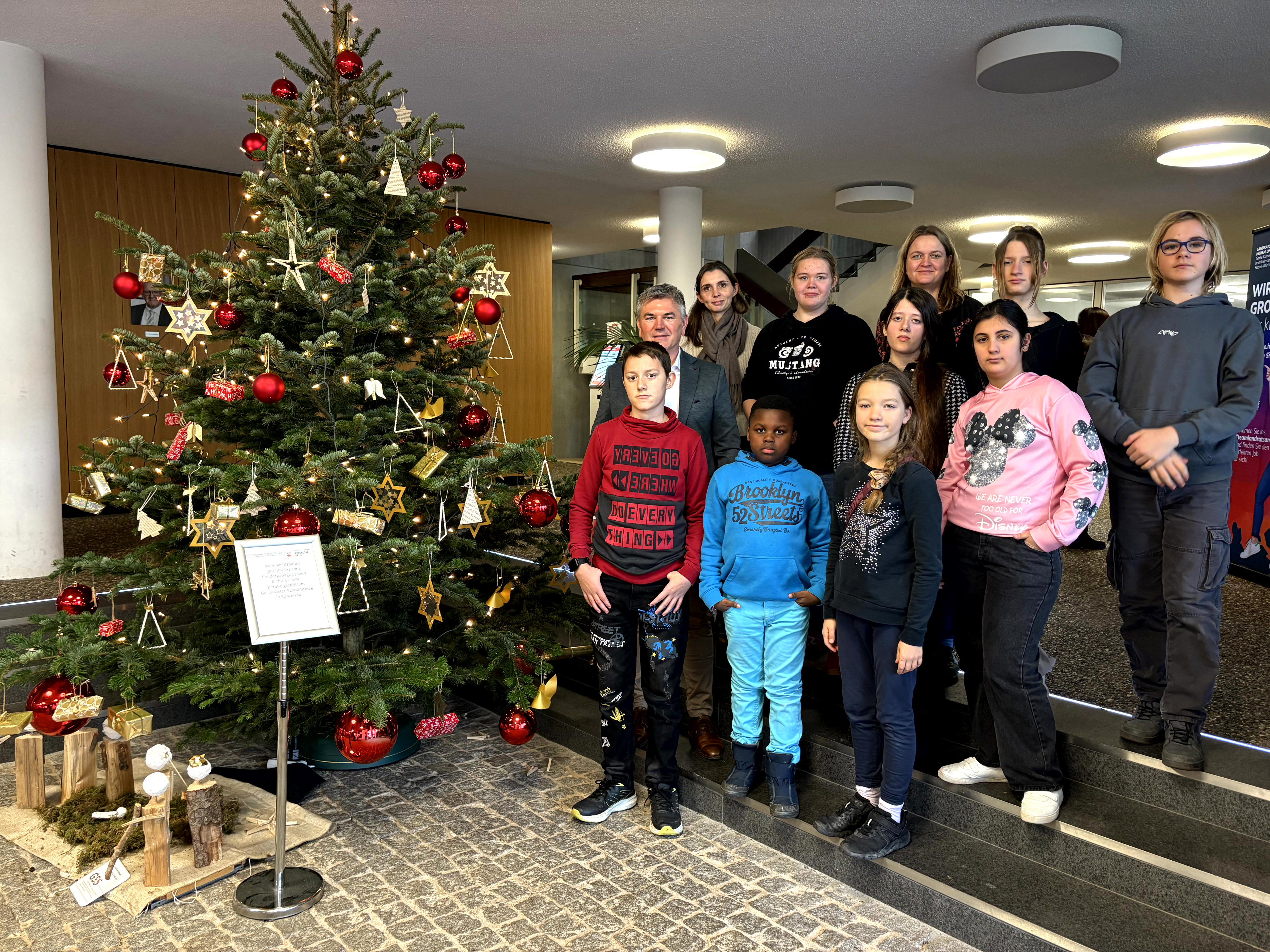 Weil Tradition festen Bestand hat: Am Donnerstag, 27. November 2025, haben sechs Schülerinnen und Schüler der Geschwister-Scholl-Schule Künzelsau den Weihnachtsbaum im Foyer des Landratsamtes Hohenlohekreis geschmückt.